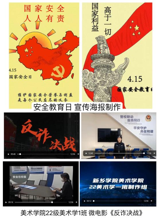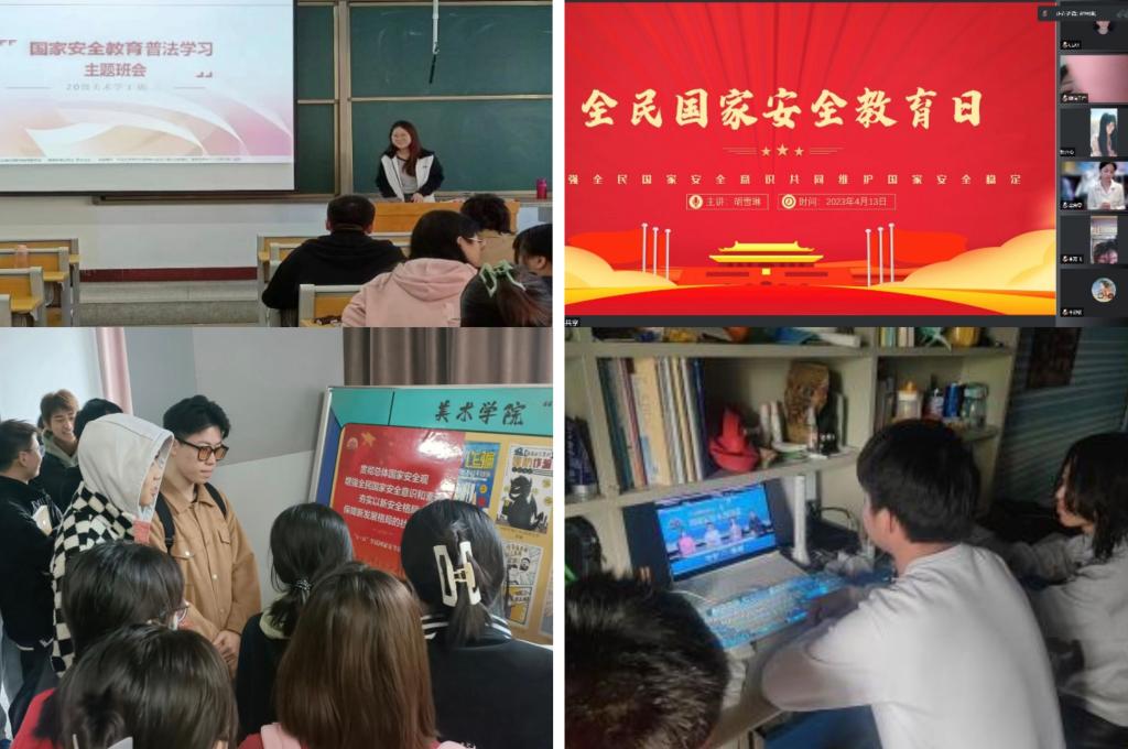 全院师生紧密围绕“贯彻总体国家安全观,增强全民国家安全意识和素养,夯实以新安全格局保障新发展格局的社会基础”的主题,通过演讲、问答、讨论等方式,线上线下相结合积极开展主题班会;组织师生积极参与线上教育学习,营造良好活动氛围;同时利用公司滚动屏幕,播放关于国家安全教育公开课等视频资源;利用微信公众号“团聚美院”发布相关推文,开展国家安全教育宣传;并结合公司实际,组织员工开展主题海报设计、微电影拍摄等形式多样的活动。